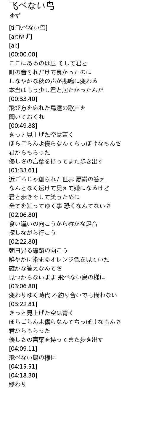 | [04:09.74] | 飛べない鳥の様に |
