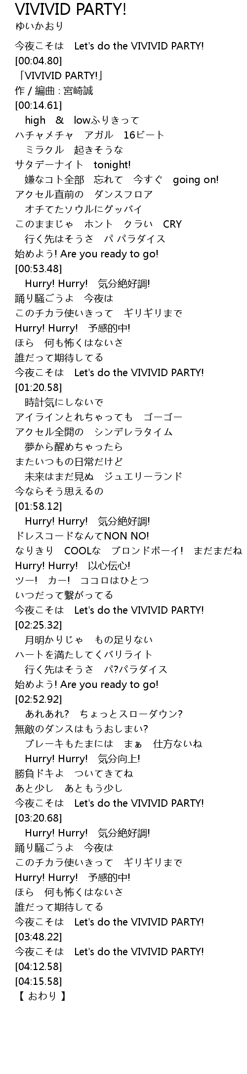 | [03:43.68] | 今夜こそは Let's do the VIVIVID PARTY! |