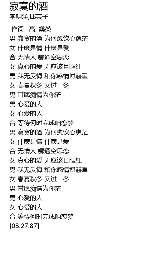 | [00:23.31] | 男 寂寞的酒 为何愈饮心愈茫 |