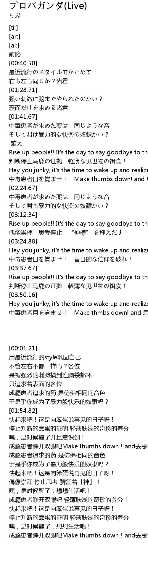 | [03:25.14] | Hey you junky, it' s the time to wake up and realize!! |
