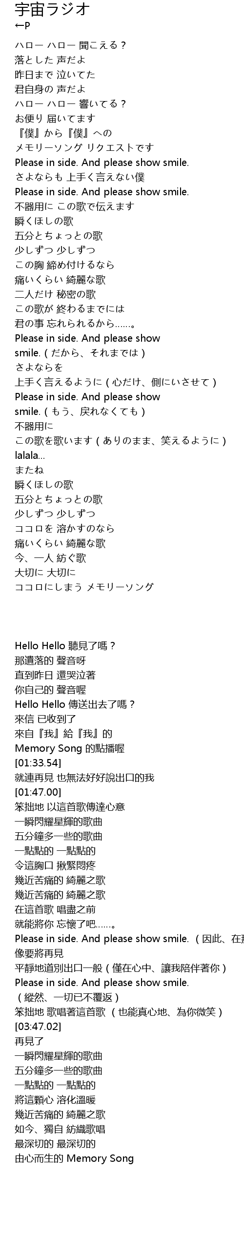 | [03:18.48] | Please in side. And please show smile.(だから、それまでは) |