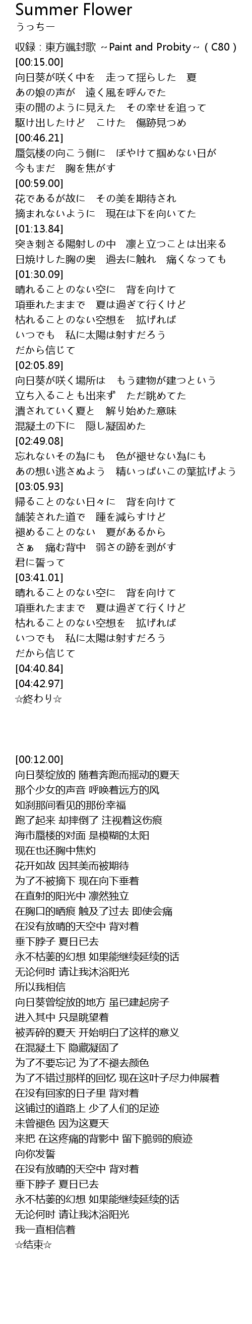 | [00:12.00] | 収録:東方颯封歌 ~Paint and Probity~(C80) |