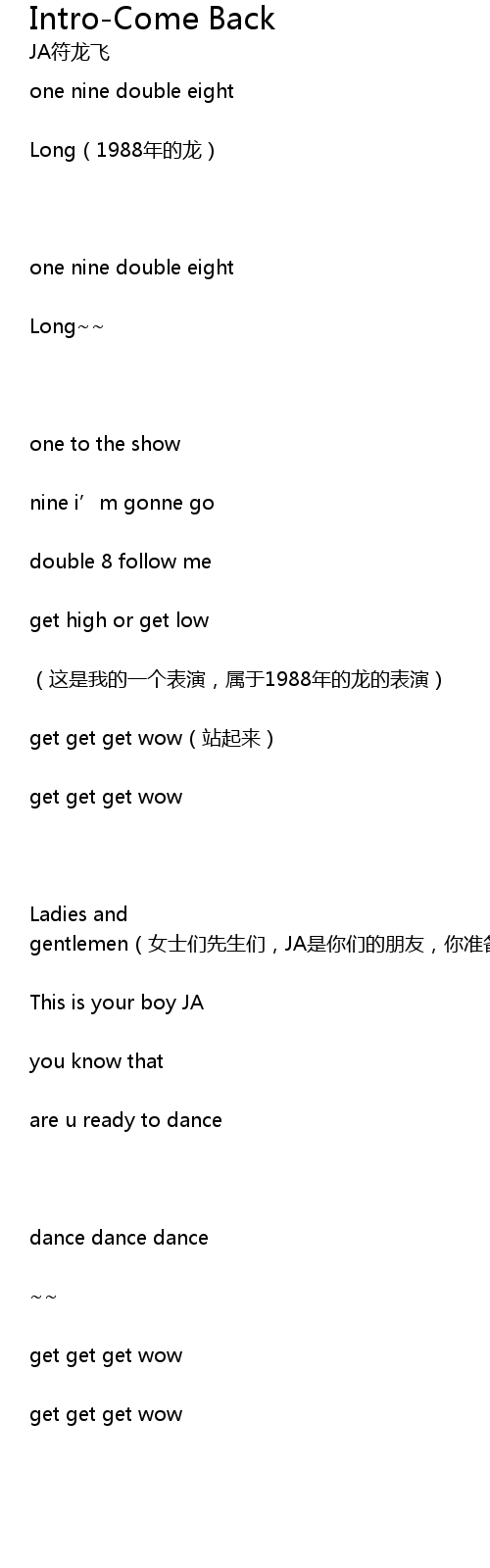 | Ladies and gentlemen(女士们先生们,JA是你们的朋友,你准备好今晚狂欢起来了么) | |