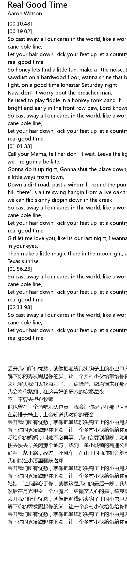 | [00:51.94] | Let your hair down, kick your feet up let a country boy show you a real good time. |