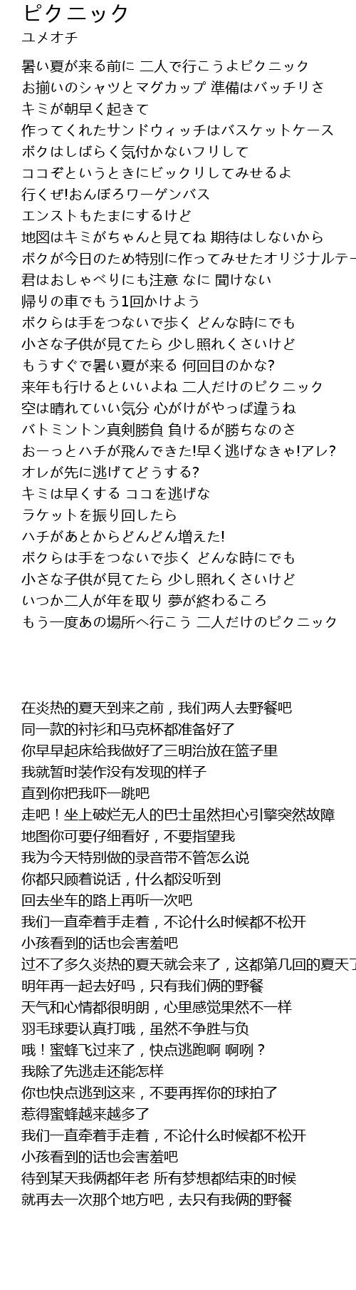 | [00:07.940] | 暑い夏が来る前に 二人で行こうよピクニック |
