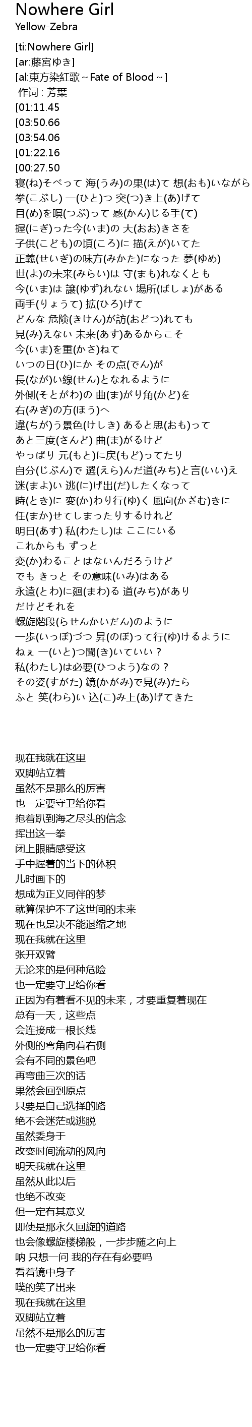 | [00:00.75][01:11.45][03:47.27] | 今(いま) 私(わたし)は ここにいる |
