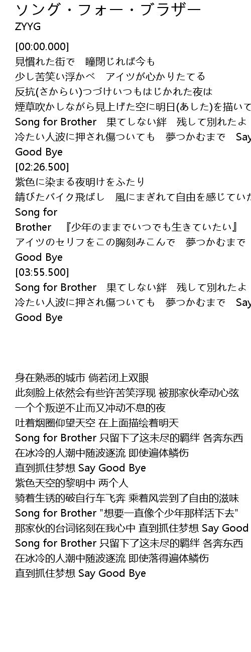 | [04:09.200] | Song for Brother 果てしない絆 残して別れたよ |
