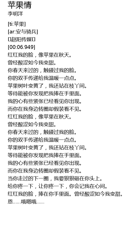 | [03:15.810] | 红红我的脸,捧在你手里面。曾经酸涩如今我变甜。 |