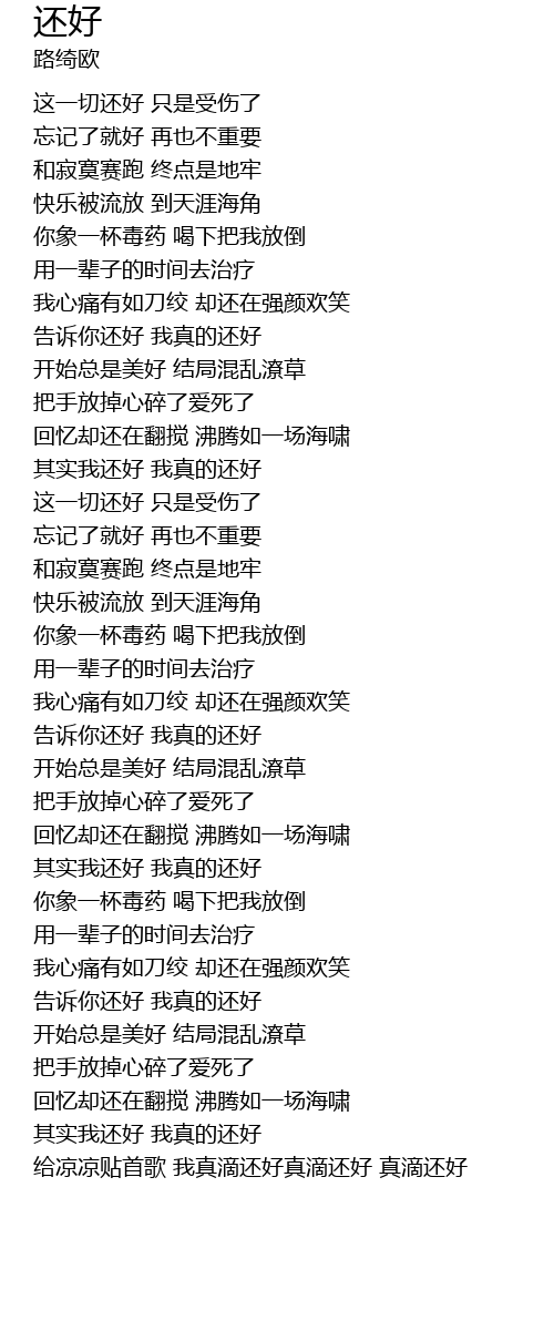 | [01:11.490] | qí shí wǒ hái hǎo wǒ zhēn de hái hǎo |