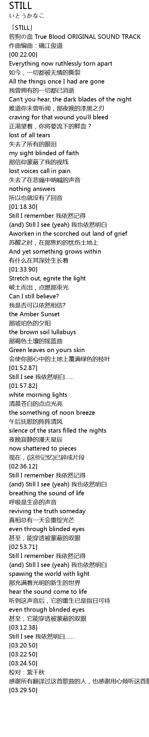 | [01:18.59] | Still I remember wǒ yī rán jì de |