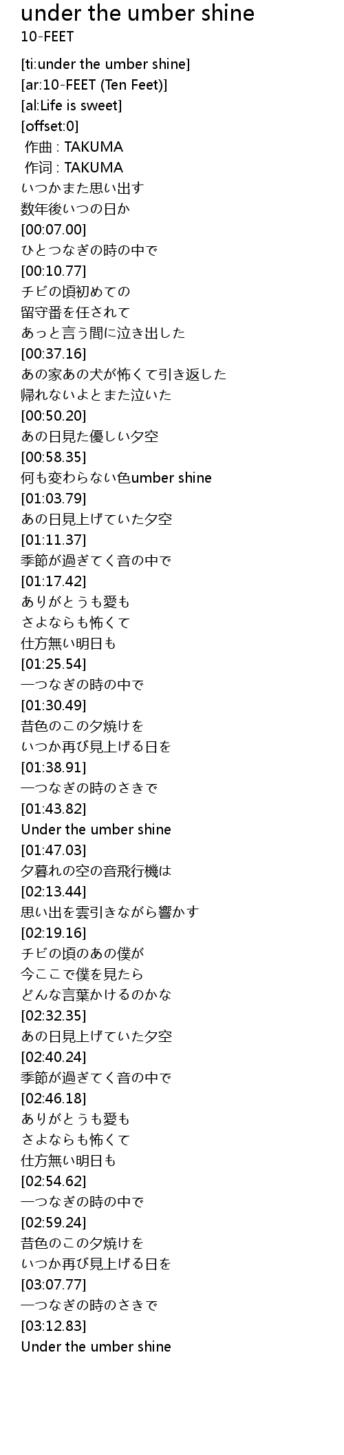 | [01:00.02] | 何も変わらない色umber shine |