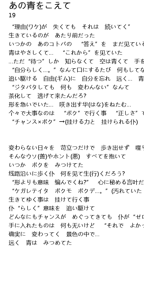 | 追い駆ける 自由(ギム)に 自分を忘れ 远く… 青をみつめてた | |