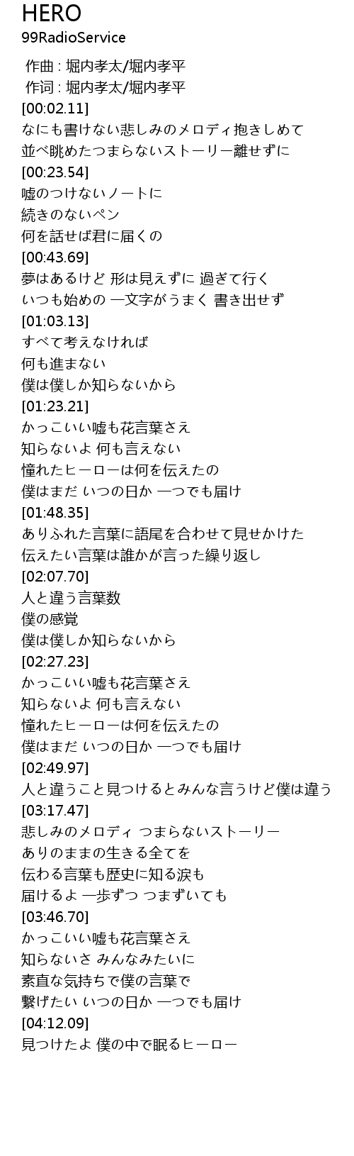 | [04:16.56] | 見つけたよ 僕の中で眠るヒーロー |
