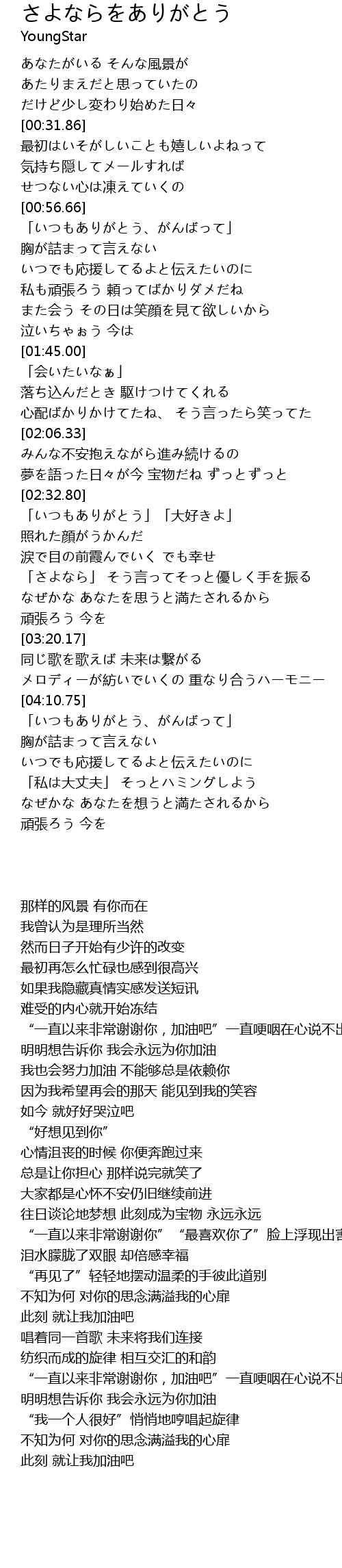 | [04:12.88] | 「いつもありがとう、がんばって」 胸が詰まって言えない |