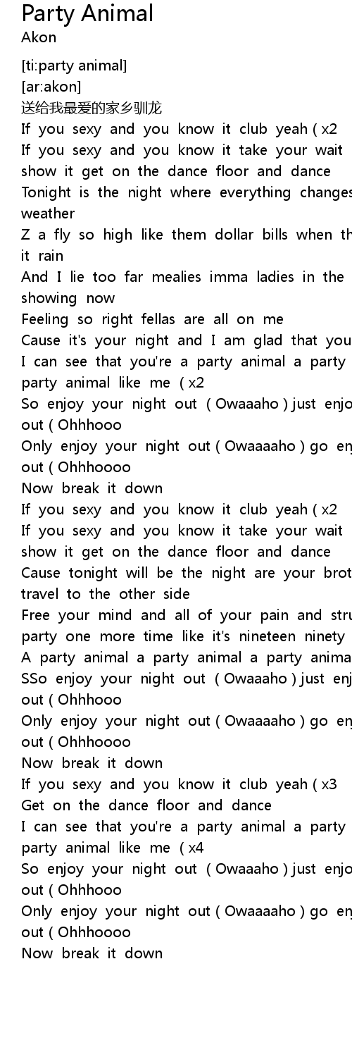 | [02:12.290] | A party animal a party animal a party animal like me x2 |