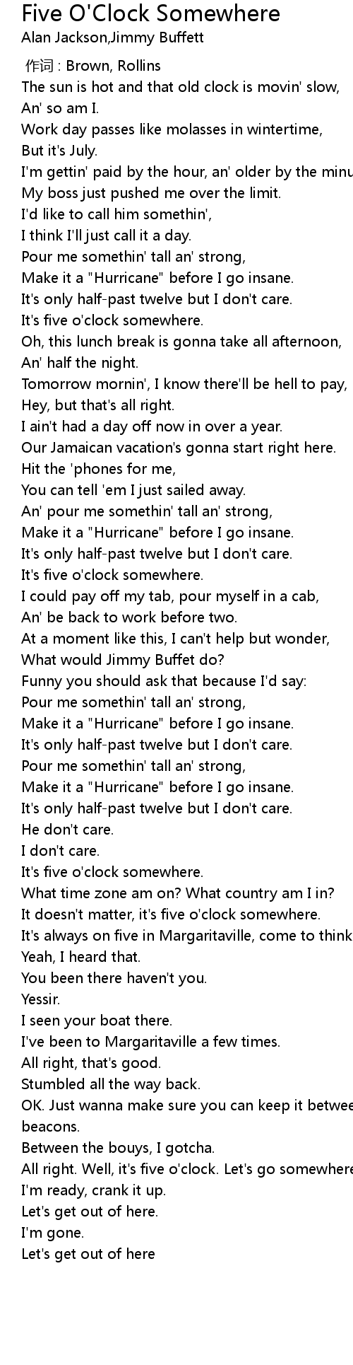 | [00:51.14] | It' s five o' clock somewhere. |