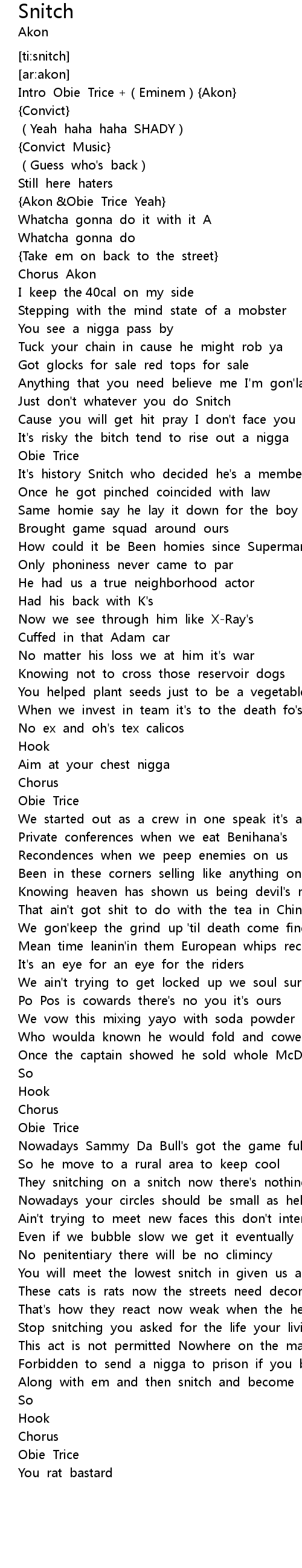 | [00:39.563] | Just don' t whatever you do Snitch |