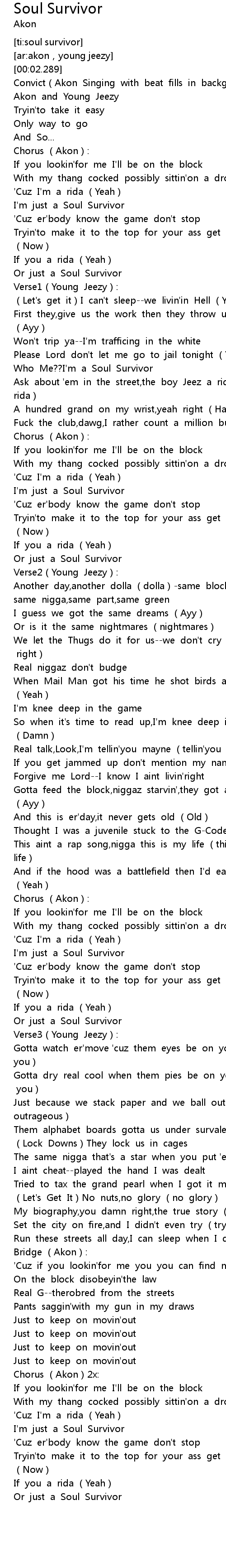 | [00:07.29] | Convict Akon Singing with beat fills in background |
