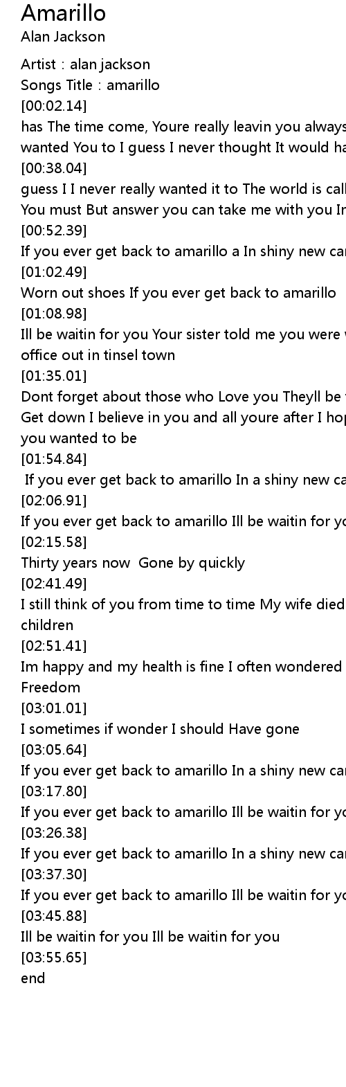 | [03:28.31] | If you ever get back to amarillo In a shiny new car or Worn out shoes |
