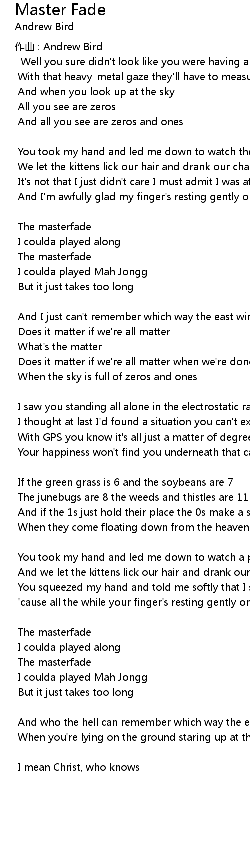 | ' cause all the while your finger' s resting gently on the masterfade | |