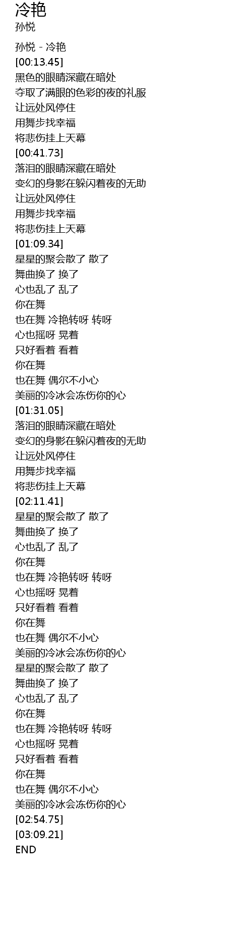 | [00:01.00] | 孙悦 - 冷艳 |