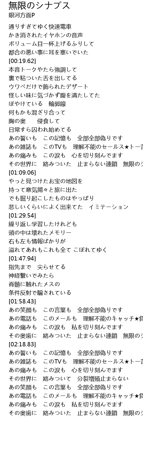 | [01:02.67] | その世界に 絡みついた 止まらない連鎖 無限のシナプス |