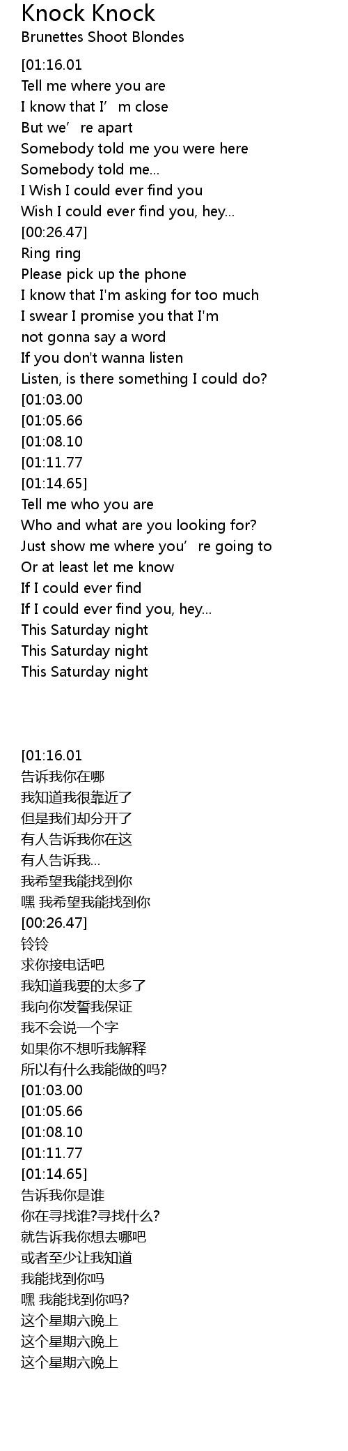 | [00:58.36][01:11.77][01:47.76] | This Saturday night |