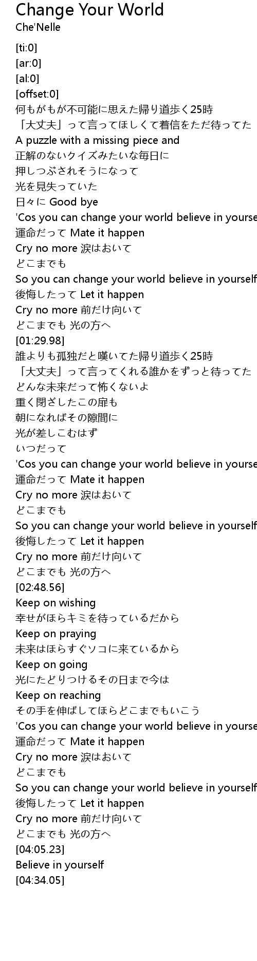 | [03:33.30] | 'Cos you can change your world believe in yourself 未来へ |