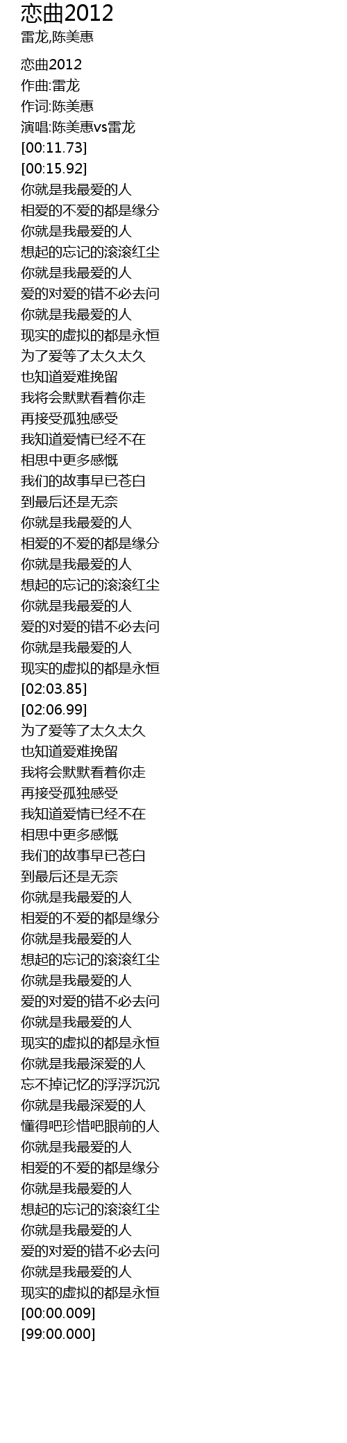| [00:07.59] | 演唱:陈美惠vs雷龙 |