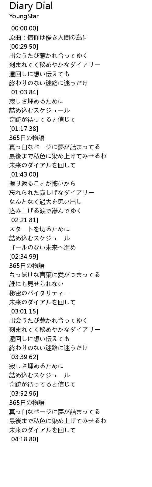| [03:20.92] | 刻まれてく秘めやかなダイアリー |