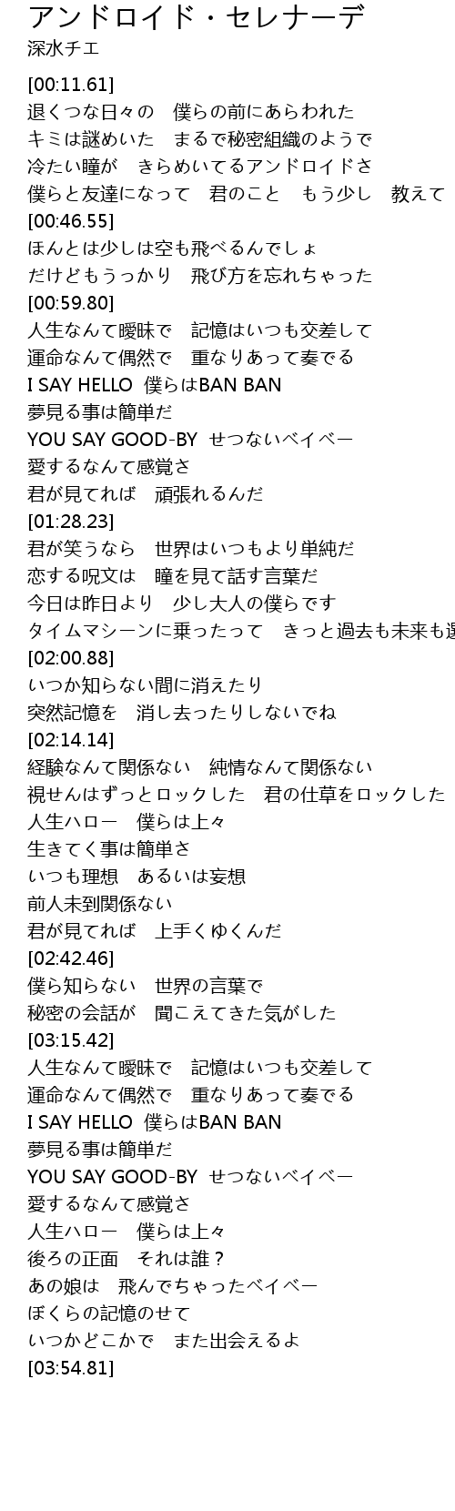 | [01:11.96] | I SAY HELLO pu BAN BAN |