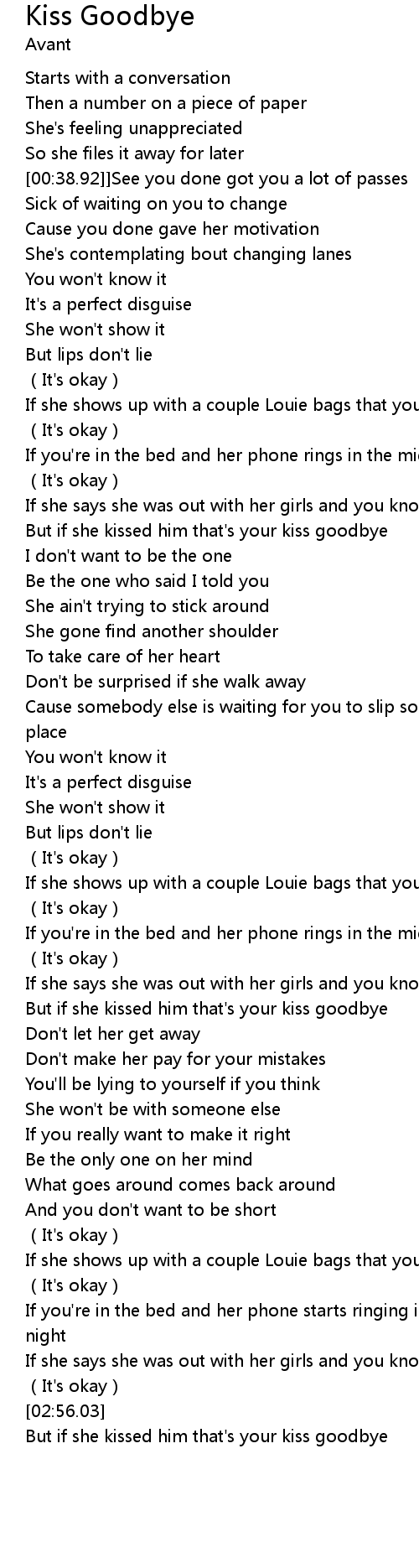 | [01:18.86] | But if she kissed him that' s your kiss goodbye |