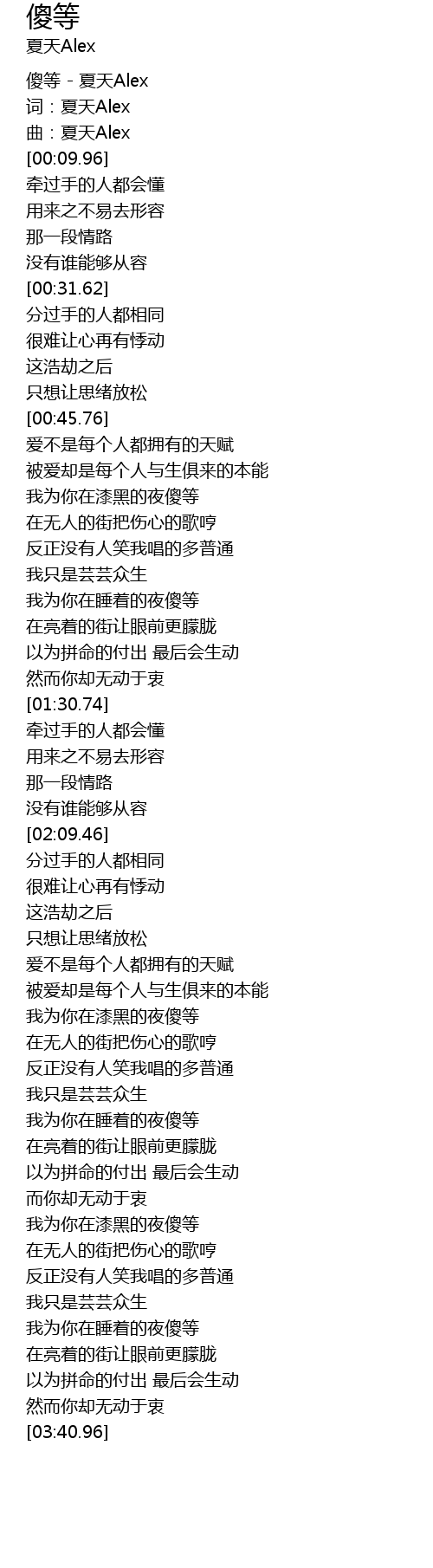 | [00:01.30] | 傻等 - 夏天Alex |