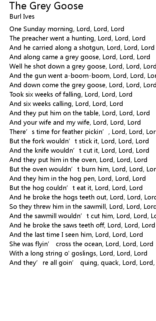 | Well he shot down a grey goose, Lord, Lord, Lord | |