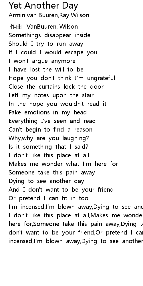 | [05:23.695] | I don' t like this place at all, Makes me wonder what I' m here for, Someone take this pain away, Dying to see another day, And I don' t want to be your friend, Or pretend I can fit in too, I' m incensed, I' m blown away, Dying to see another day |