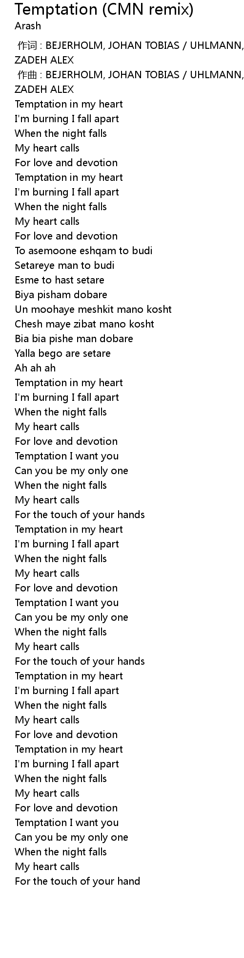 | [00:01.000] | 作曲 : BEJERHOLM, JOHAN TOBIAS / UHLMANN, ROBERT / RAHIM, LABAF ZADEH ALEX |