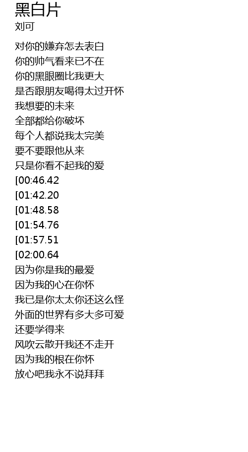 | [01:05.18][01:54.76] | 为什么你一眼不看我 |