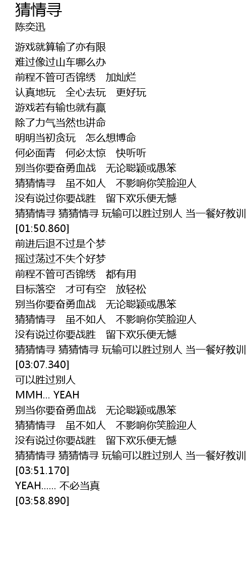 | [03:41.400] | 猜猜情寻 猜猜情寻 玩输可以胜过别人 当一餐好教训 |