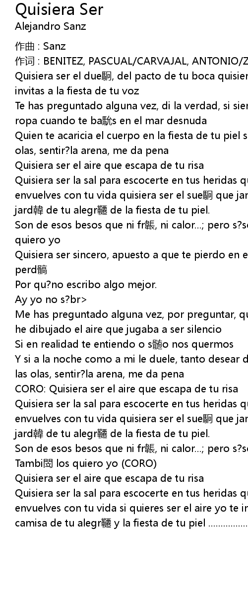 | Quisiera ser la sal para escocerte en tus heridas quisiera ser la sangre que envuelves con tu vida si quieres ser el aire yo te invito ni yǔn a mi camisa, mi camisa de tu alegr qiān y la fiesta de tu piel ........................... CORO |
