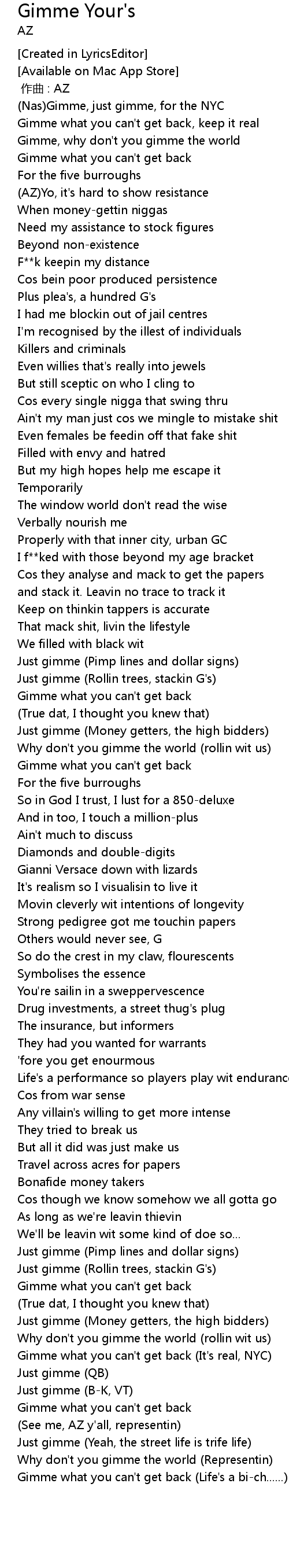 | [02:35.695] | Gimme what you can' t get back It' s real, NYC |