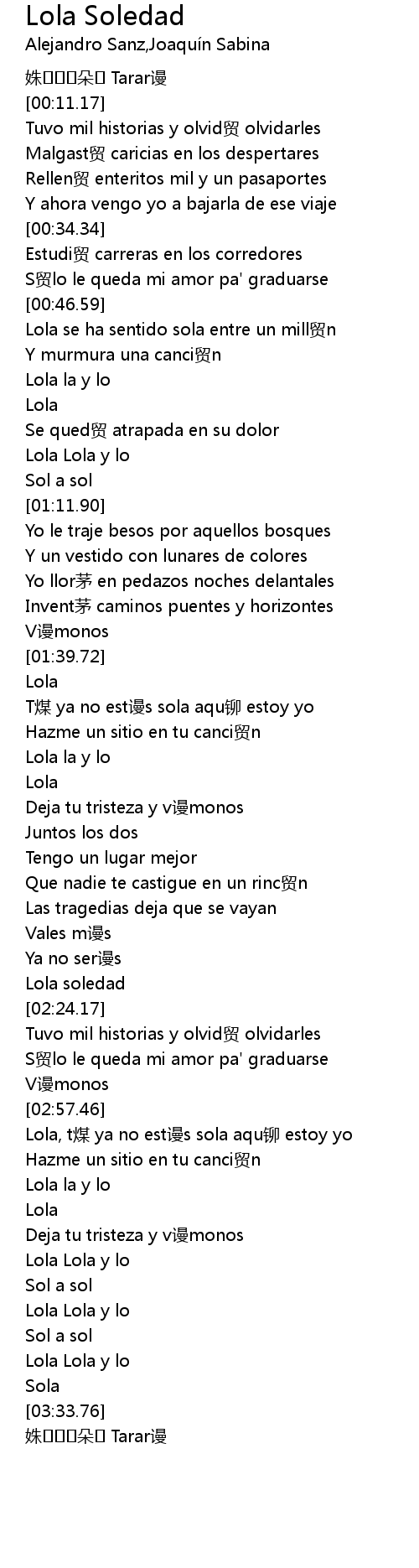| [02:58.14] | Lola, t煤 ya no est谩s sola aqu铆 estoy yo |