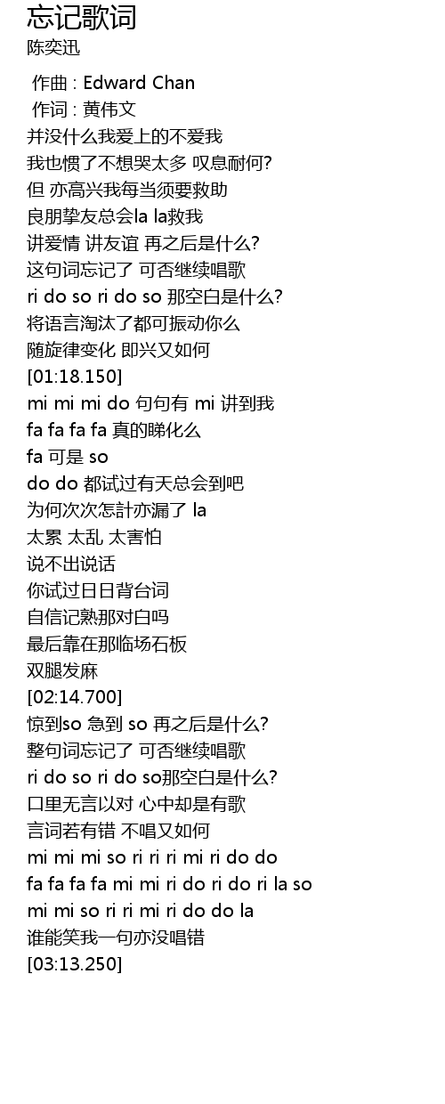 | [02:24.670] | 整句词忘记了 可否继续唱歌 |