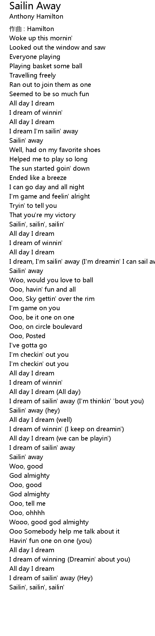 | I dream, I' m sailin' away I' m dreamin' I can sail away | |