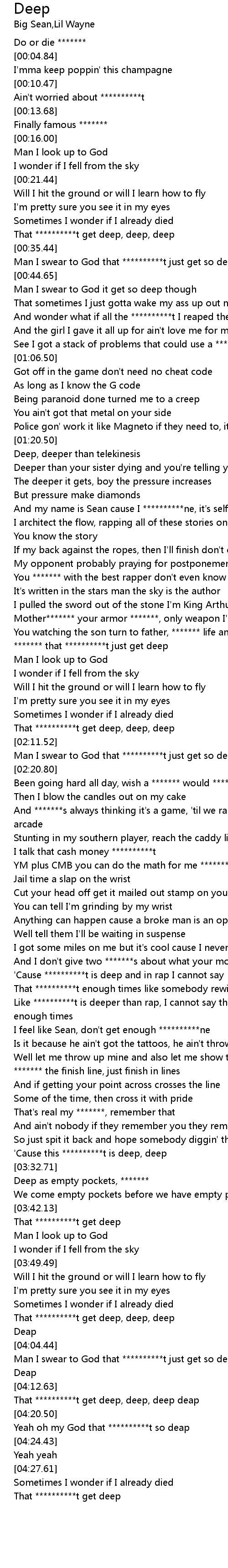 | [02:13.49] | Man I swear to God that **********t just get so deep, deep, deep, deep |