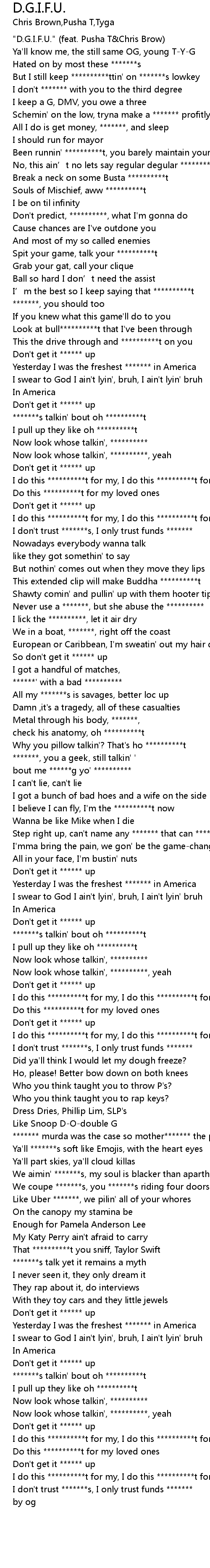 | [00:00.00] | " D. G. I. F. U." feat. Pusha T Chris Brow |