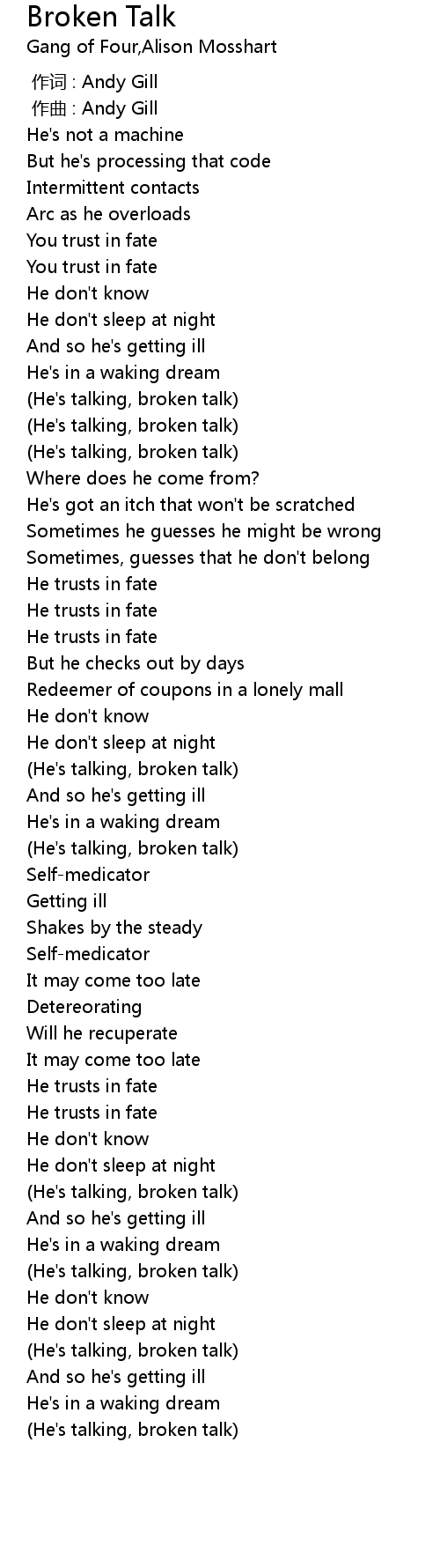 | [03:34.74] | He' s talking, broken talk |