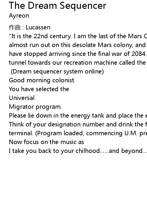 | " It is the 22nd century. I am the last of the Mars Colonists. The air supply has almost run out on this desolate Mars colony, and the food supplies from Earth have stopped arriving since the final war of 2084. I am walking through the tunnel towards our recreation machine called the Dream Sequencer. I hope it will sweeten my final days..." Lana Lane voice Dream sequencer system online | |