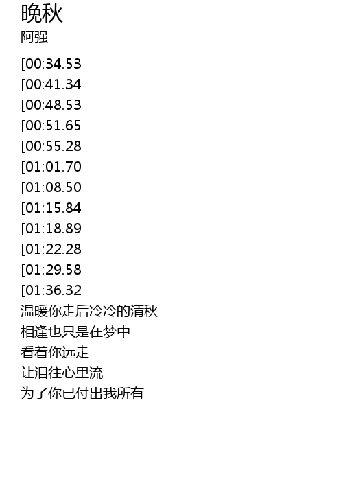| [02:31.17][00:34.53] | 在这个陪着枫叶飘零的晚秋 |