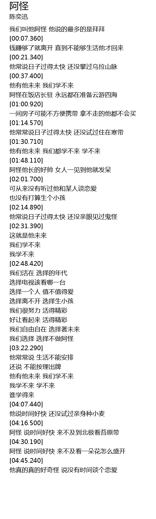 | [00:00.310] | 我们叫他阿怪 他说的最多的是拜拜 |