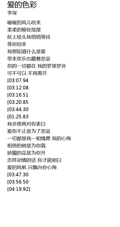 | [03:29.39][03:12.08][02:17.92][01:06.33] | chōng mǎn zhe ài de sè cǎi |